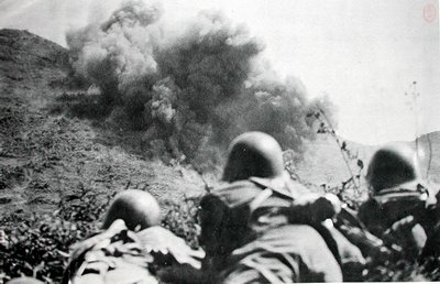 五十四十分,我随二连终于穿插到越军48号高地地区,还没等我们缓口气,我军的炮火急袭就开始了,先是老山主峰方向传来零星的爆炸声,倾刻,来自北方的大批炮弹将整个老山地区植变了火树银花,排山倒海似的爆炸声强烈地刺激着人们的身心,我的手不停的颤抖,我的心呢,我甚至能感觉到它已经怦然跃出了胸腔,眼前的一切都是那么的不真实,火光,硝烟,碎石,残桩,这就是战场!而我,就即将投入战场,投入死亡!炮击仍在继续,连队开始散开战斗队形了,攻击就要开始了,48号高地仍然在炮击中保持中沉寂,这让我们感到一种莫名的恐惧。三连在47号高地的攻击行动已经展开了,刹那间各种轻武器的射击声充斥了整个空宇,而我们面前的48号居然仍如此沉寂安静,我们甚至直起身子开始大步跃进了!越军呢?为什么还是没有子弹迎接我们,一切都象是一场实弹演习,太不正常了!我紧随着丛副连长,他的手一直不停的挥动着,冲锋,前进,我们就在他的身后。枪声终于响起来了,先是一挺轻机枪,紧接着另一挺重机枪也加入了射击的行列,越军的火力组织的捧极了,漫波而至的弹雨几乎涵盖了整个攻击地域,冲在前头的几个兵一瞬间就被打成了筛子。我的手心里全是汗,第一片弹幕打来的时候我就趴倒在地了,到处是子弹的啸叫声,还有手榴弹的爆炸声,我不敢抬头,初入战阵的豪情早已被揪心撕肺的惊恐粉碎的彻彻底底干干净净!我就那么低着头往越军阵地蠕动,不时有子弹打入身边的大地里,更多的惨叫源自身后左右,那是战友们临死前的嚎啸,我爬过的何止是大地,还有最先被打倒的弟兄身边;流淌的鲜血染红了山野,他们的身子布满了血孔,这就是我的战友吗,也许上一个小时我们还在一起互相搀扶着摸爬前进呢!都说士兵见不得鲜血,见了血就得疯就得狂,而我呢?我不知道我的第一梭子弹是怎样射击出去的,我只知道丛副连长也被打到了,数枚重机枪子弹将他刚直起来的身子掀翻了个,我就在他的左侧,他的死亡是瞬间即至的,巨大的伤口洞穿了他的前胸和上腹,一个兵连滚带爬的向他扑过来,他一定还想救他,我也想扑过去!越军的子弹却将我死死的控制在原地!我想哭,那个兵还没有接触到副连长的遗体就被一枚近距离爆炸的手榴弹结束了生命,我的大脑简直要被血腥搅沸烧熟了!
